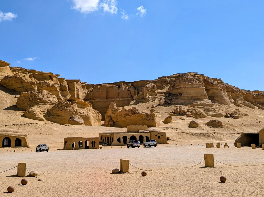 点评:We visited Wadi Al-Hitan today with the Hatam Ali Fayoum Tour($145) from our Lake Qarun hotel. After checking in at the Wadi Al Rayan NP entrance($50), our driver departed the nicely paved road to cross the open desert. This bouncing drive followed a general track over small dunes & across flat lake beds with infinity views that ended at the roughly paved lane to the Wadi Al-Hitan entrance. Here the landscape became dramatic with high sandstone cliffs, plateaus and odd shaped house sized rocks along with the beautiful architecture of the museum structures. Inside we watched a 12 minute introductory video in English, before encircling the excellent exhibits on the 40 million year transformation of climate that provided the habitat for a hyena-like mammal to evolve into whale ancestors. Lots of period fossils.
