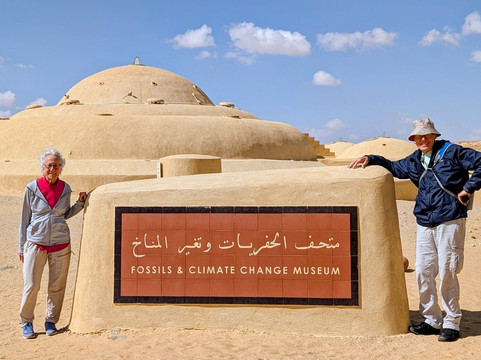 翻译:今天我们参加了哈塔姆·阿里法尤姆旅游公司(Hatam Ali Fayoum Tour,费用145美元)的行程,从卡伦湖畔的酒店出发,游览了鲸鱼谷(Wadi Al-Hitan)。在瓦迪赖扬国家公园(Wadi Al Rayan NP)入口处办理入住手续(门票50美元)后,司机离开了铺设良好的公路,穿越了开阔的沙漠。这段颠簸的旅程沿着一条小路,翻越着小沙丘,穿过平坦的湖床,沿途尽是无垠的景色,最终到达通往鲸鱼谷入口的崎岖小路。这里的景色变得壮丽起来,高耸的砂岩峭壁、高原和形状奇特的巨石,以及博物馆建筑群的精美设计,都令人叹为观止。进入博物馆后,我们观看了一段12分钟的英文介绍视频,然后参观了精彩的展品,了解了4000万年来气候的演变,正是这种演变为一种类似鬣狗的哺乳动物进化成鲸鱼祖先提供了栖息地。展品中有很多不同时期的化石。