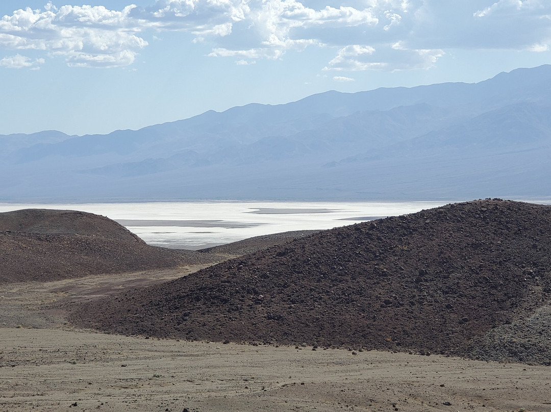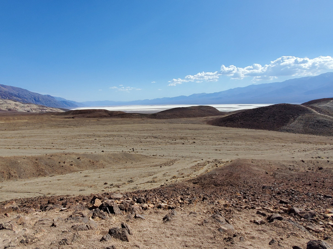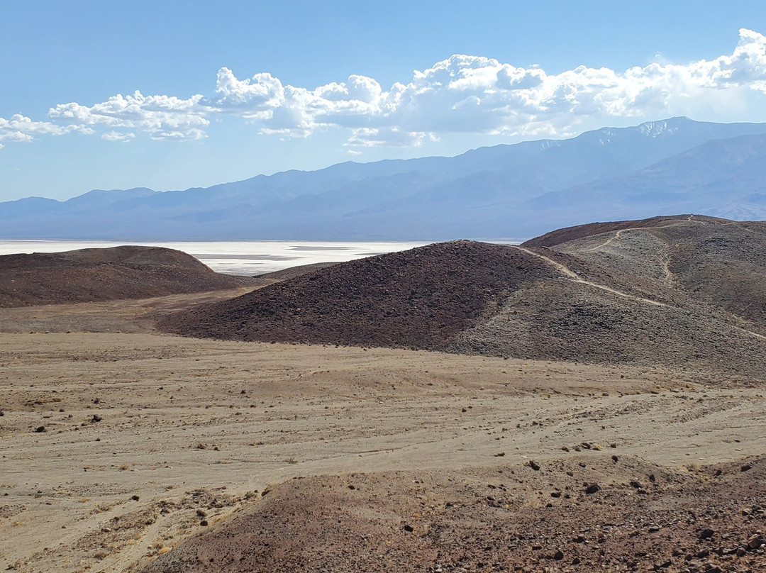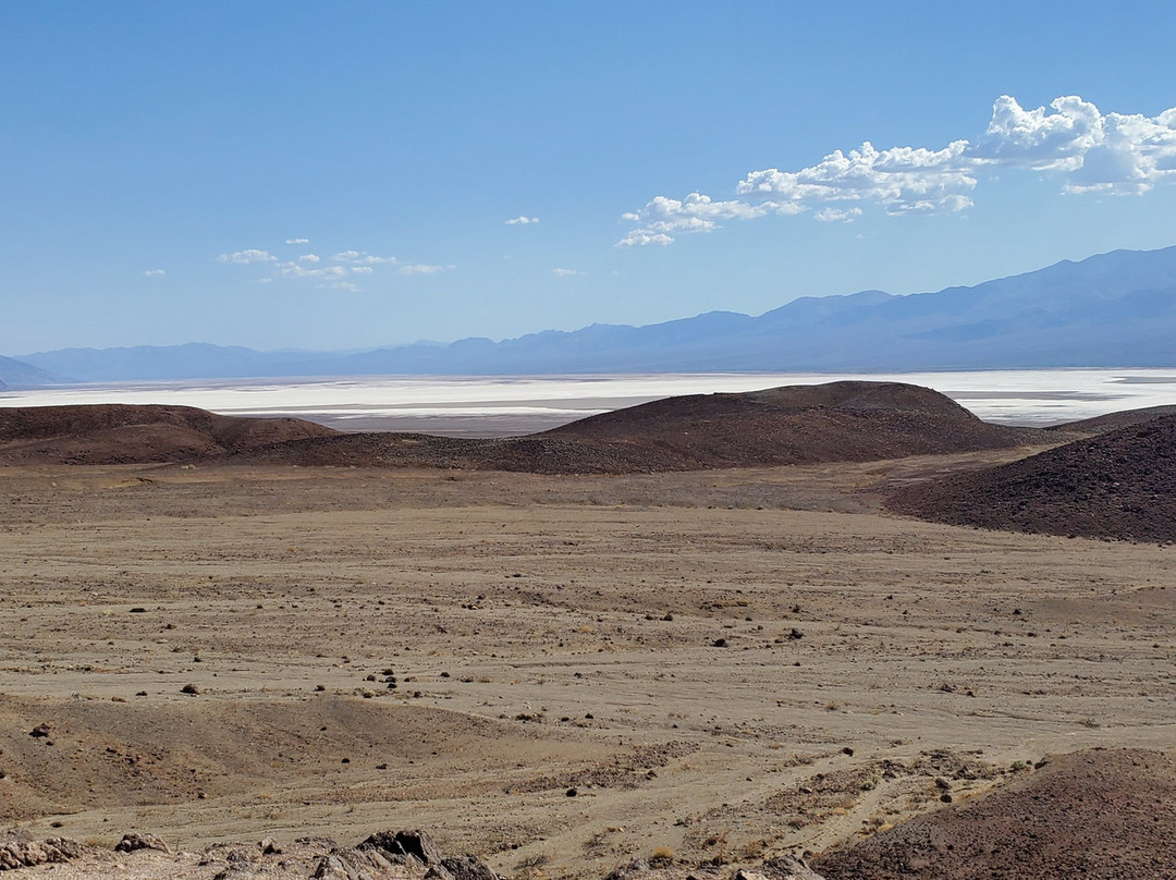 我在第一个停车处停了下来。那里有一座相当陡峭的山坡,尤其是在 100 华氏度(约 37 摄氏度)的午后阳光下,我感到气喘吁吁。当我到达山顶时,周围的景色就像我想象中的火星一样。我甚至能看到远处恶水盆地的盐滩,但别误会。这里可不是什么值得长时间停留的美丽地方。想想火星吧。