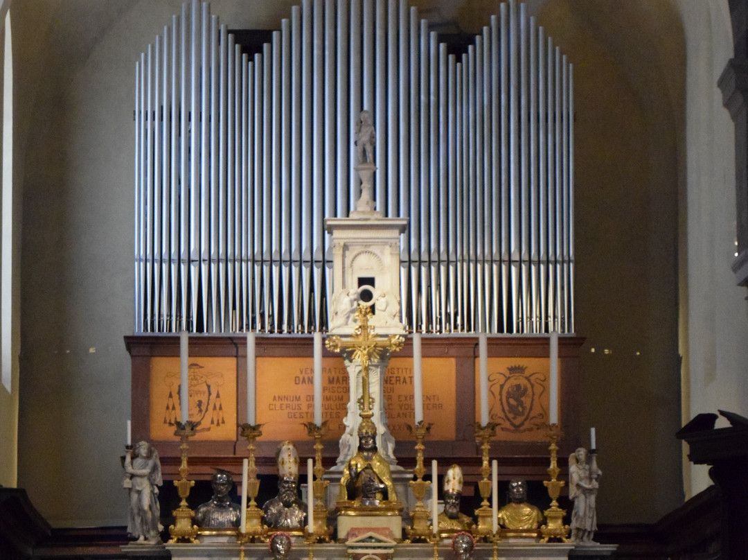 教堂呈经典的拉丁十字形,拥有三个中殿,由圆柱和柱头隔开;侧殿内设有众多小堂,收藏着十六世纪画家的作品。