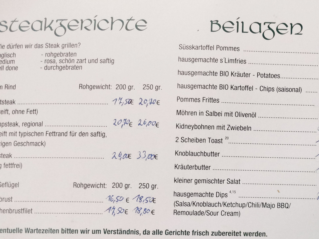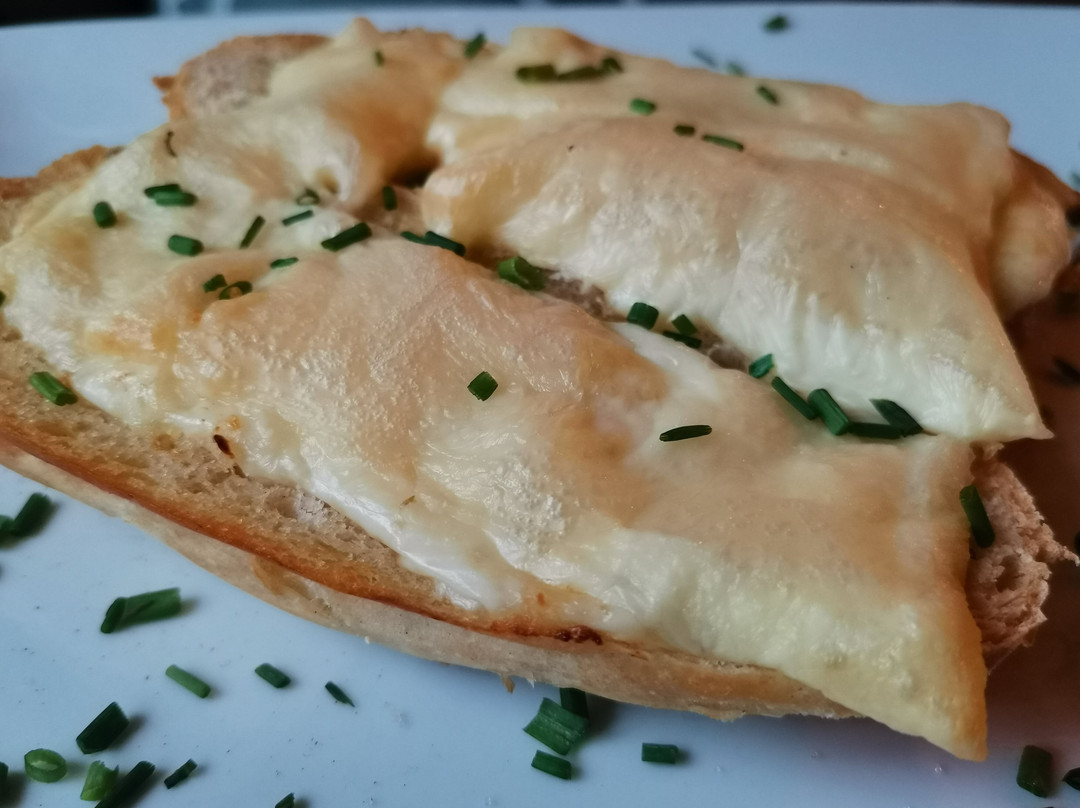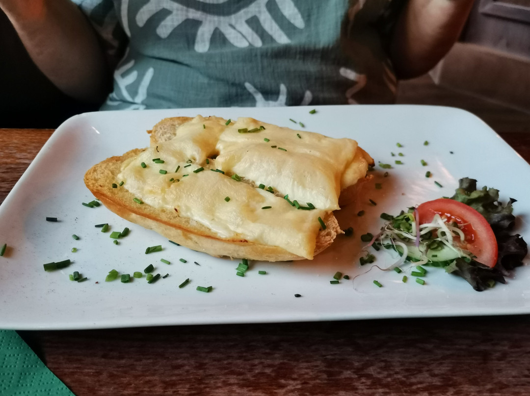 对于一家酒吧来说,菜单相当丰富。我们坐在厨房旁边,欣赏到各种菜肴的精美拼盘。这不是小酒馆风格,可以算作高档餐厅。因为我们已经用餐完毕,所以我们点了蒜蓉面包配烤过头的奶酪,所以不算主菜。这道菜用新鲜切碎的细香葱烹制而成,味道鲜美。厨师肯定忙得不可开交,因为所有肉块的长度都一样,而且都经过精心的手工切割,呈现出漂亮的布鲁诺伊斯风味。再加上我们路过看到许多摆盘精美的餐盘,这些都促使我们决定第二天再来。