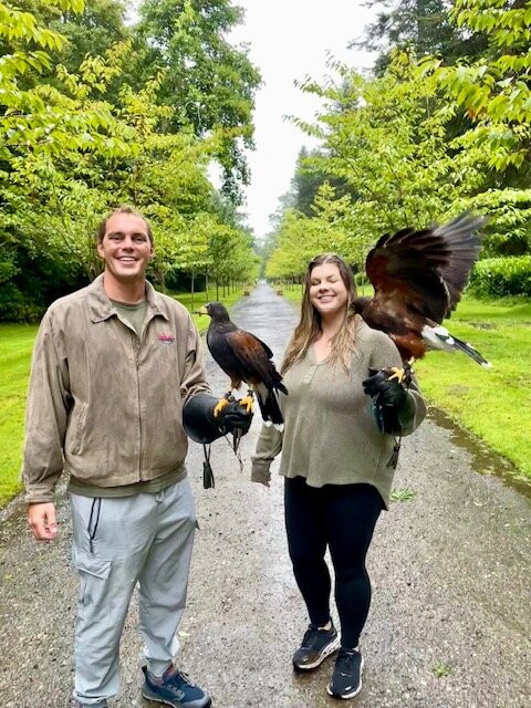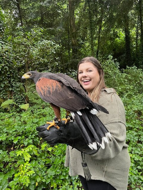 We walked with Swift and Samhradh, such beautiful, powerful creatures. It was a typical day in Ireland, the rains started while we were on our walk however, we were walking and flying the hawks under a thick forested canopy of trees so the rains didn't hinder the experience at all. We made memories that day that will last a lifetime; truly a highlight of our two beautiful weeks in Ireland!