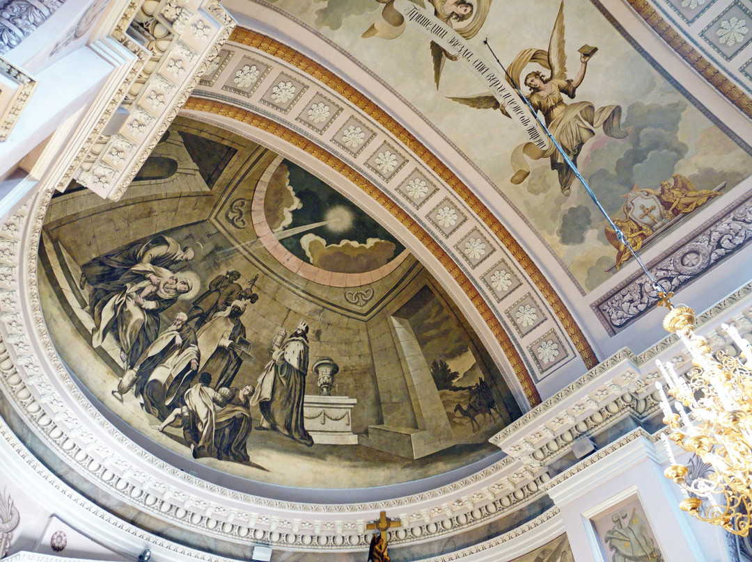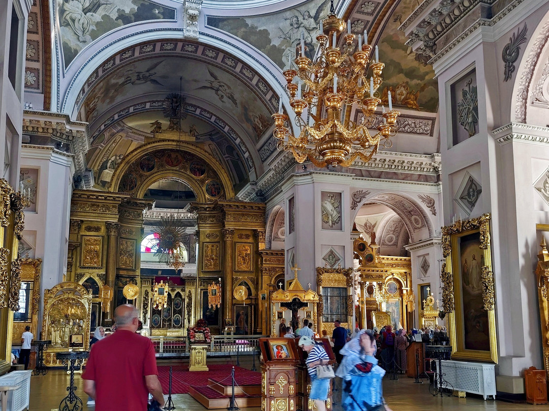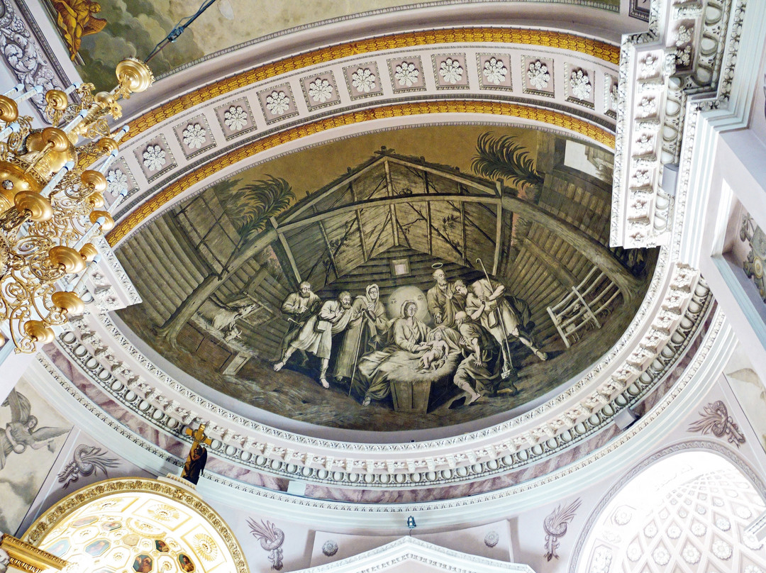 教堂内部同样是古典主义风格,墙壁、拱门、柱子以及教堂穹顶上的灰色画作更突显了这种独特的风格。在东正教教堂中,避免在室内设计中使用过多的色彩是非常罕见的(我暂时想不出任何类似的教堂)。