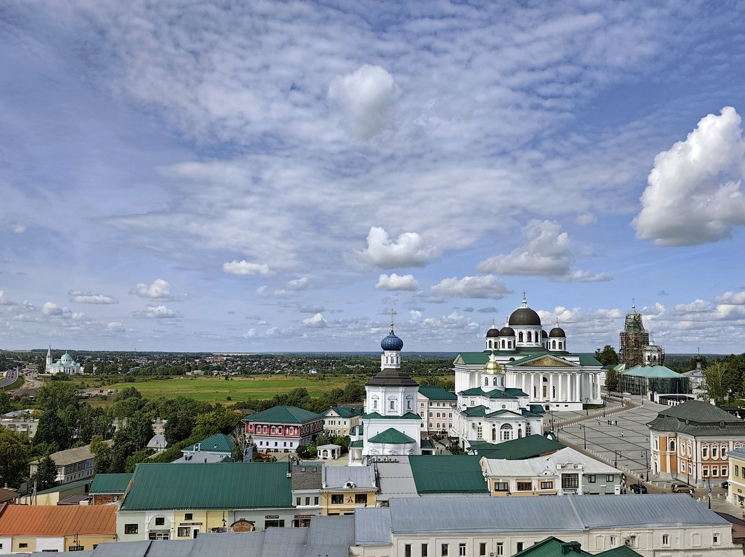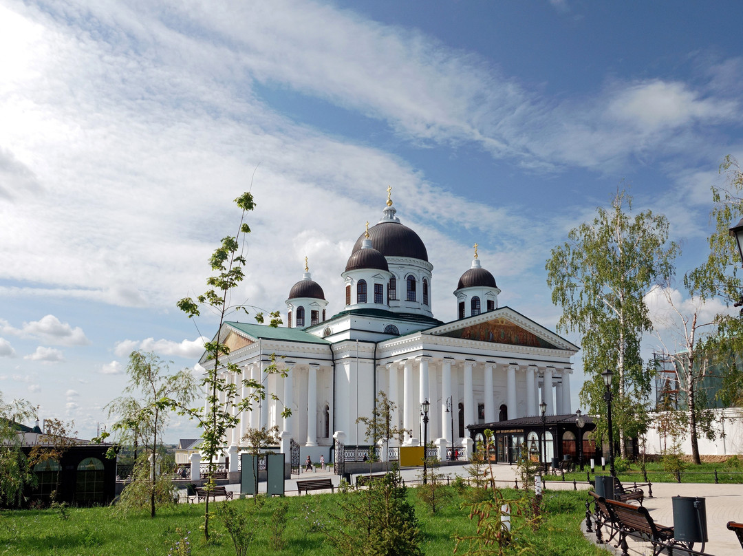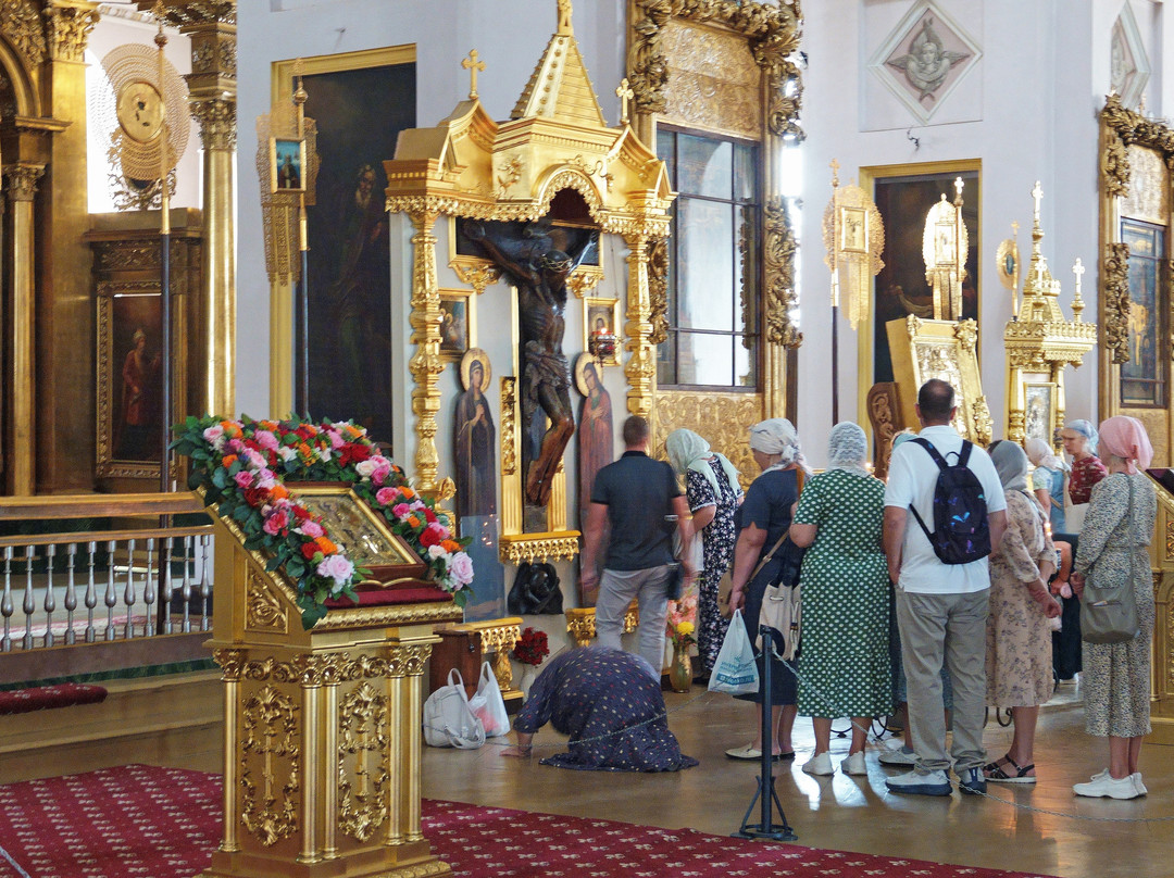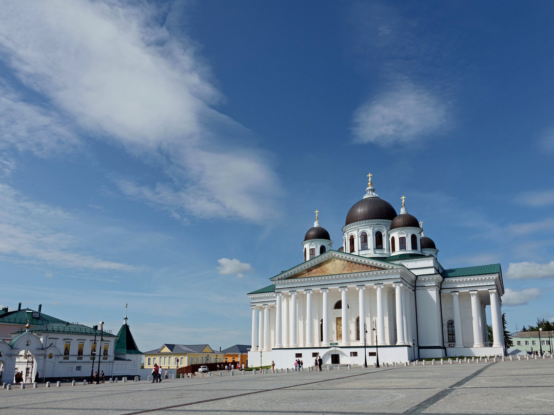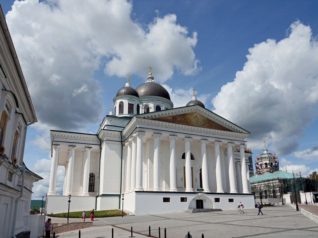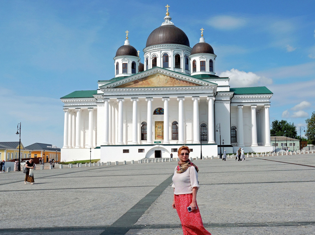 点评:Совершенно столичный Собор в довольно захолустном городке. Выходишь от парковки на Соборную площадь и застываешь в изумлении (из-за деревьев Монастырского сквера его не сразу увидишь, и тем неожиданнее его появление). И хотя на эту площадь выходят ещё и храмы Свято-Троицкого женского монастыря, но они совершенно теряются в таком соседстве: грандиозное сооружение в классическом стиле с четырьмя 12-колонными портиками по четырём сторонам, с ионическими капителями и прекрасных пропорций. Одна мелочь: на площадь ориентирована алтарная сторона Собора, а вот вход в него устроен с противоположной от площади стороны.