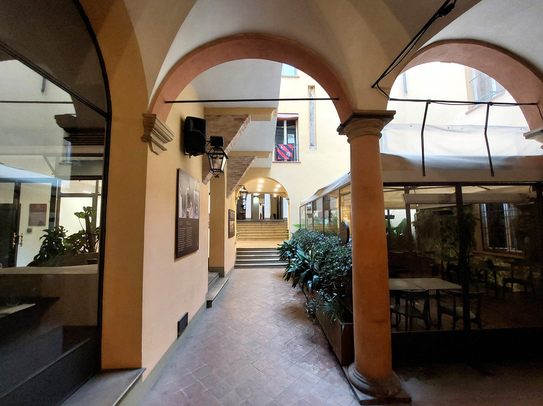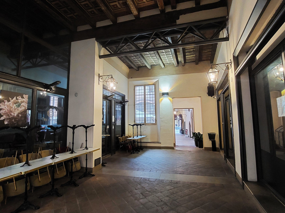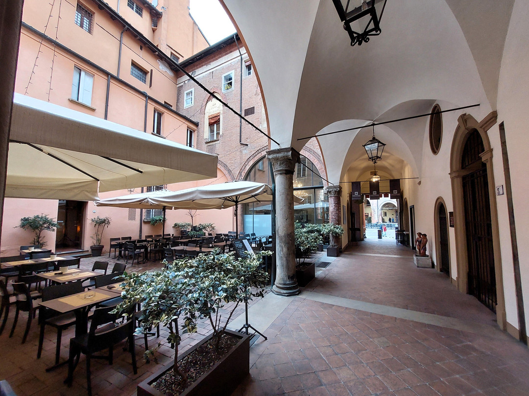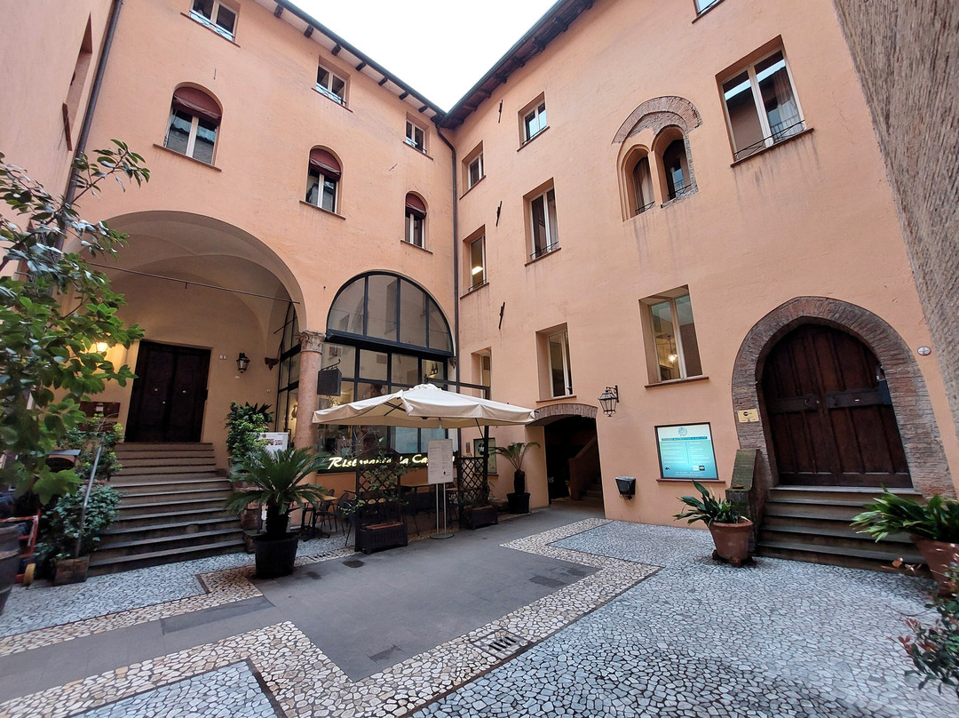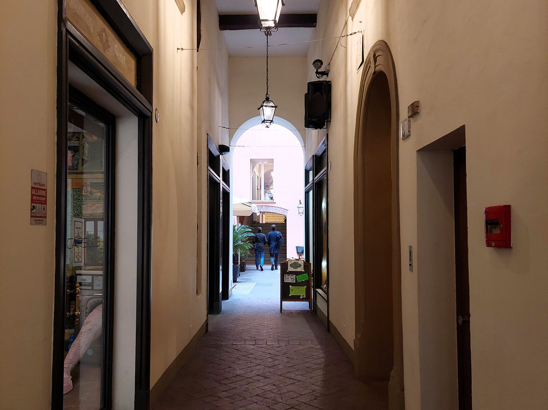 翻译:长而复杂的通道,大部分都被覆盖,连接了从 Porta Ravegnana 广场向东延伸的三叉戟街中的两条:马焦雷街和圣斯特凡诺街(后者在部分路段暂时变为“圣斯特凡诺广场”)。这条通道在 20 世纪 90 年代按照现在的样子布置,在或多或少宽阔的走廊、庭院、门厅、楼梯之间穿过 Isolani 建筑群的地下;当然,最令人着迷的是建于 13 世纪的 Casa Isolani,它拥有拐杖形状的高(9 米)木制门廊,尽管俯瞰马焦雷大街的正面是 19 世纪修复的结果(除其他外,插在门廊木制额饰上的三支箭和两根砖砌的加固柱都是这次修复的成果);而且,从圣斯特凡诺广场一侧进入宫廷的入口处,即以前的博洛尼尼宫(19 世纪由伊索拉尼家族购买),也值得关注,因为它具有从晚期哥特式到文艺复兴式的过渡风格:除了顶部有半身像的尖窗外,檐口也值得注意,上面布满了壁龛,里面放着人物头像和陶土花瓶。沿着构成通道的空间,在中世纪和文艺复兴时期的建筑与明显的现代干预之间,有各种商业机构,包括多家餐厅,以及通往私人公寓的通道(在圣斯特凡诺广场的入口附近还有一家酒吧)。