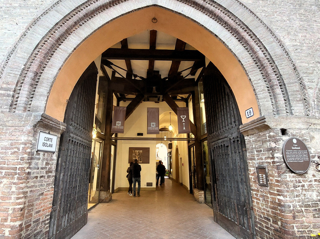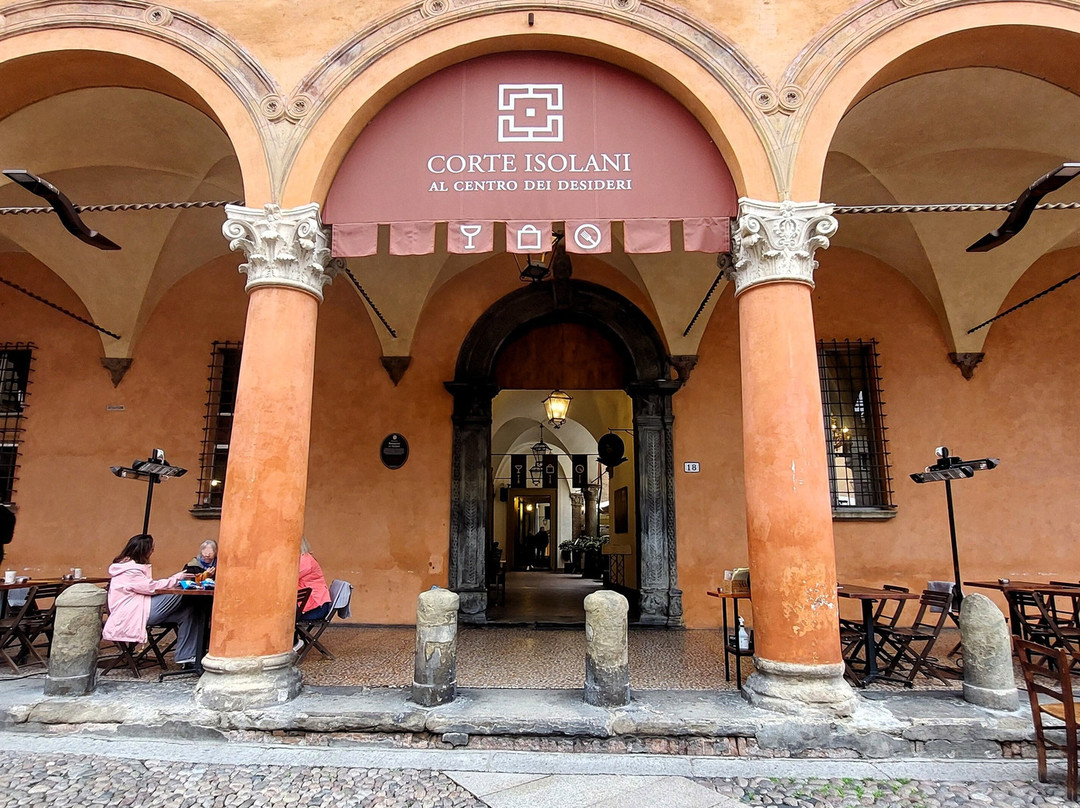 点评:Lungo ed articolato passaggio per lo più coperto che collega tra loro due delle tre vie del tridente che da piazza di porta Ravegnana vanno verso est: Strada Maggiore e via Santo Stefano (quest'ultima nel tratto in cui diventa provvisoriamente "piazza Santo Stefano"). Il passaggio, sistemato nelle attuali vesti negli anni '90, tra corridoi più o meno ampi, cortili, androni, scalinate, passa sotto al complesso dei palazzi degli Isolani; sicuramente il più fascinoso è la Casa Isolani, del '200, con il suo alto (9 metri) portico in legno a forma di stampella, anche se il prospetto che affaccia su Strada Maggiore è frutto di un restauro ottocentesco (a tale restauro risalgono tra l'altro le tre frecce conficcate nell'architrave lignea del portico e i due pilastri di rinforzo in mattoncini di laterizio); ma anche l'ex palazzo Bolognini (aquistato dagli Isolani nel XIX secolo) che segna l'ingresso alla corte dal lato di piazza Santo Stefano, è più che degno di attenzione, nel suo stile di transizione dal tardo-gotico al rinascimentale: a parte le finestre a sesto acuto sormontate da busti, è da notare il cornicione, fittissimo di nicchie che ospitano teste e vasi di cotto. Lungo gli ambienti che costituiscono il passaggio, tra architetture medievali e rinascimentali, e interventi chiaramente moderni, si susseguono vari esercizi commerciali, tra cui più di un ristorante, ed accessi ad appartamenti privati (vicino all'ingresso di piazza Santo Stefano c'è anche un bar).