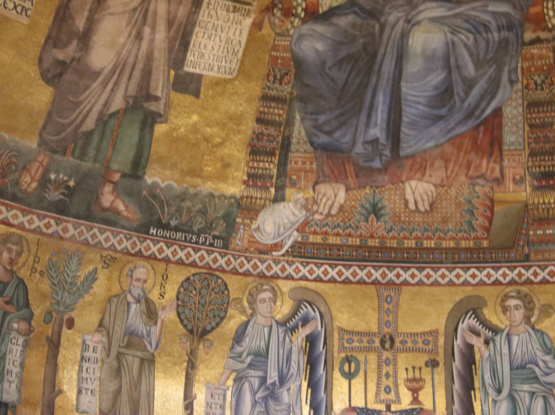 La basílica es bastante grande. Lo que más destaca es su interior bizantino, así como los medallones que adoran las parece por cada uno de los papas que ha habido. Ya estaban preparando para el último.
