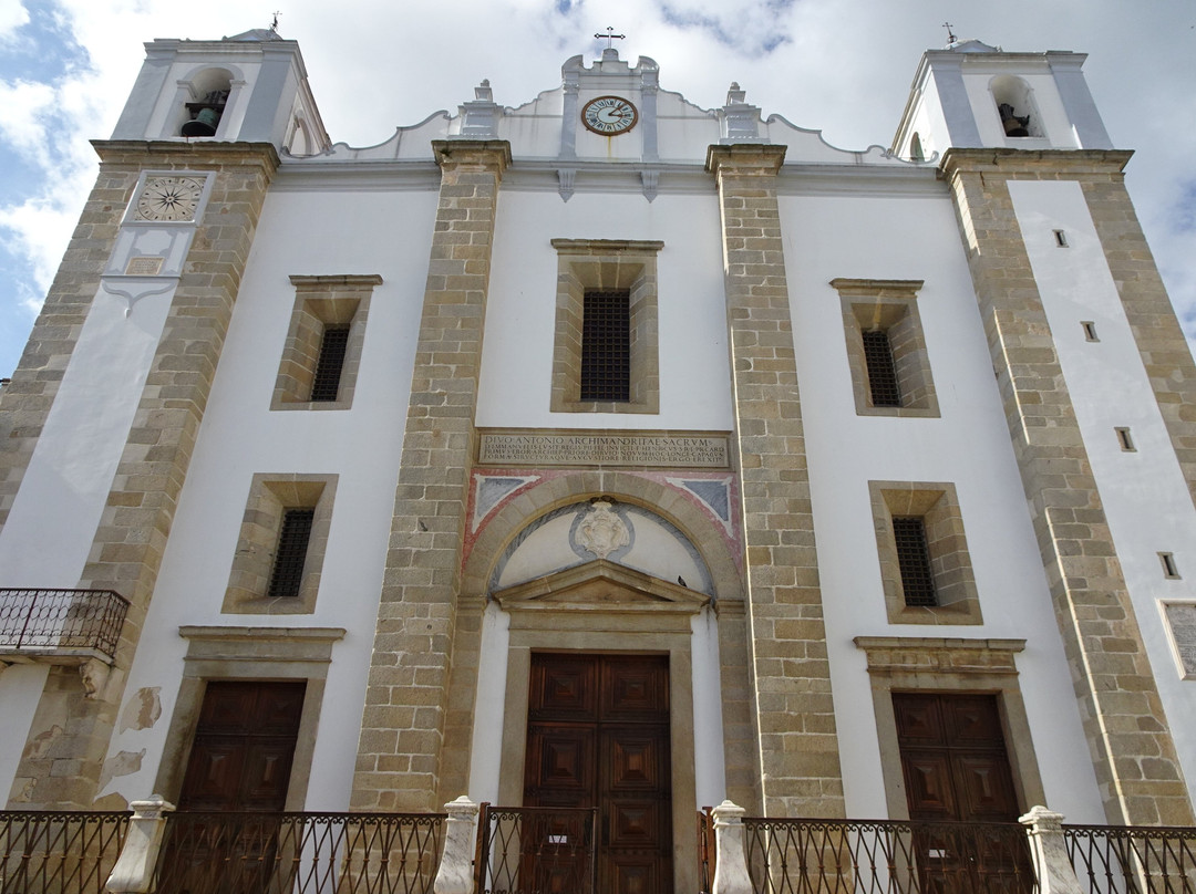 点评:Kościół mieści się na na głównym placu miasta Praca do Giraldo więc jest popularny wśród odwiedzających .Dość nietypowe są jednak godziny kiedy jest otwarty dla zwiedzających .Zbudowany został przez królewskich architektów w latach 1557-63 .Późnorenesansowy kościół był wzorem do naśladowania dla później budowanych kościołów ,zwłaszcza w prowincji Alentejo .Jego fasadę po bokach zamykają dwie wieże dzwonnicze. Portal nad głównym wejściem otoczony jest dwoma mniejszymi po jego bokach .Wnętrze kościoła zdominowane jest przez unikatowy marmurowy fronton ołtarza głównego i zestaw jego złoconych ołtarzy .Pochodzi on z pustelni Sao Antoninho a datowany jest na XIV wiek. Duże wrażenie pozostawiają potężne jońskie kolumny wspierające kościelne sklepienie . Wystrój kościoła został zmieniony pod koniec XVIII wieku w duchu barokowo -rokokowym .Boczne kaplice posiadają również bogato zdobione ołtarze .Wstęp jest bezpłatny jedynie za robienie zdjęć należy wpłacić 0,50 euro .