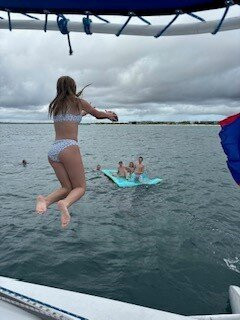 我们沿着海岸(大约半英里外)游了大约一个小时,直到我们来到 Playa del Carmen 附近的一个地方,在那里我们浮潜并在船上游泳了一段时间。船员允许孩子(和成人)跳下船,并提供了一个漂浮筏供他们游泳。在此期间,船员准备了一些美味的酸橘汁腌鱼、pica del gallo 和鳄梨酱,份量很足,每个人都很快吃完了。