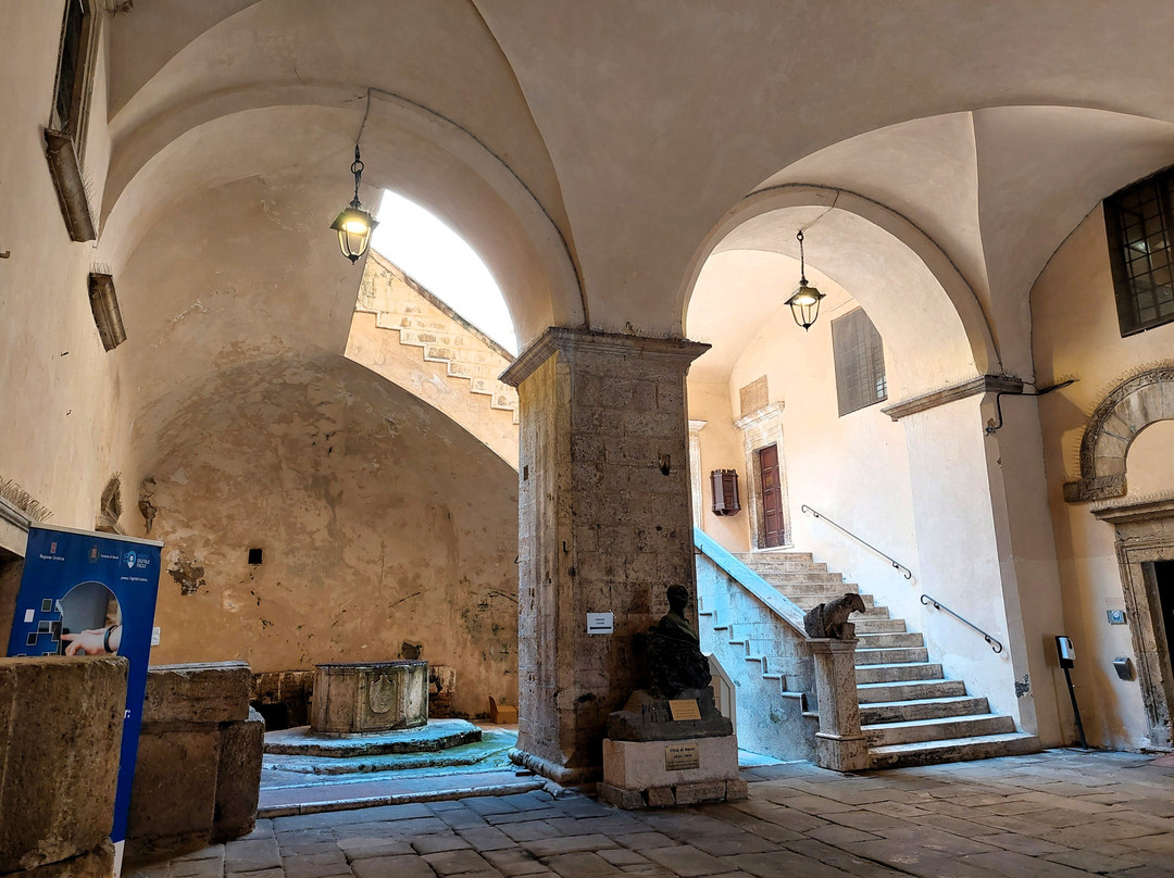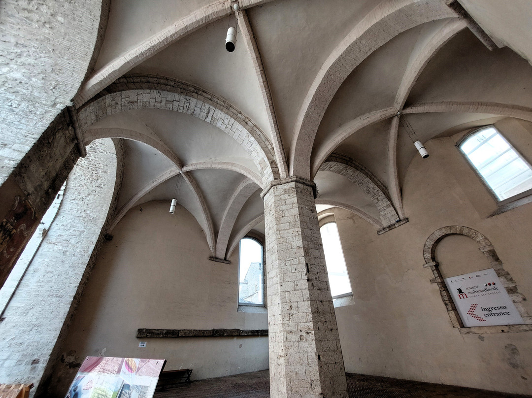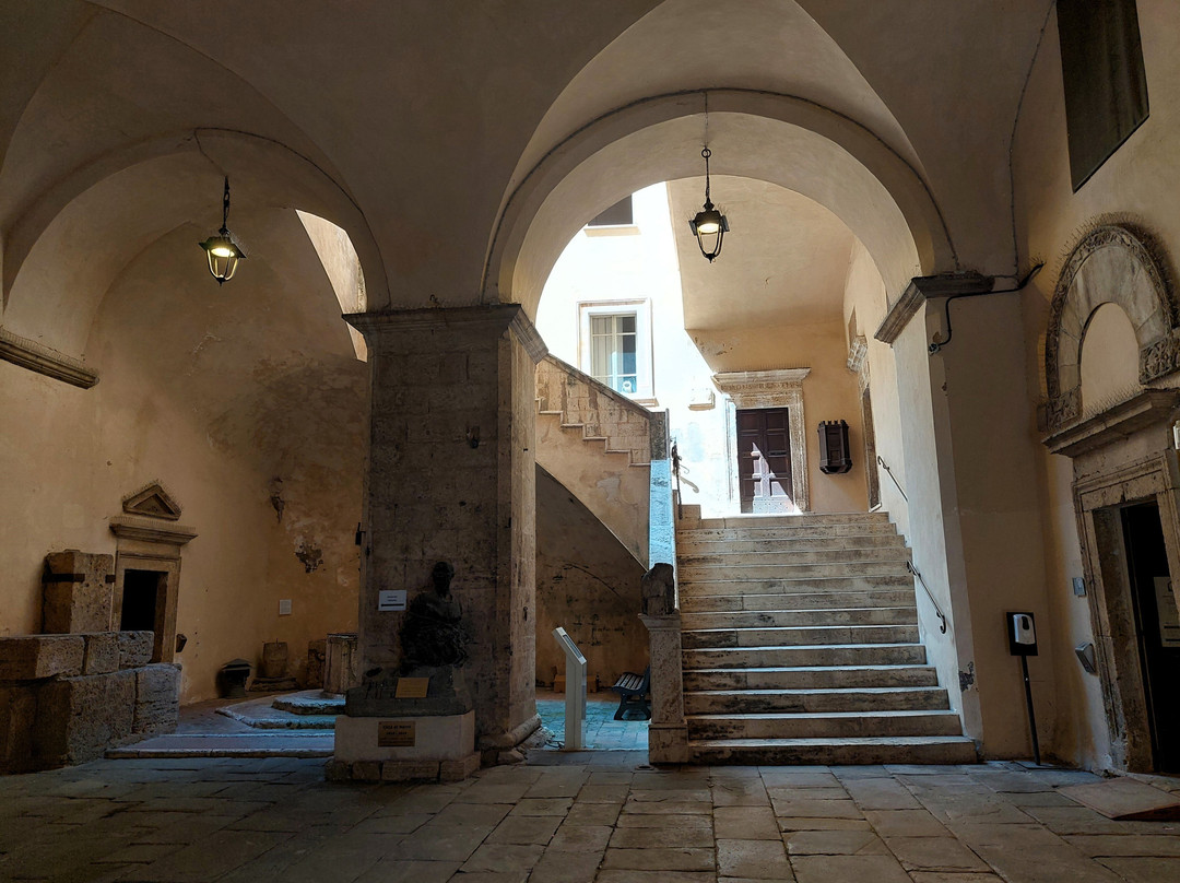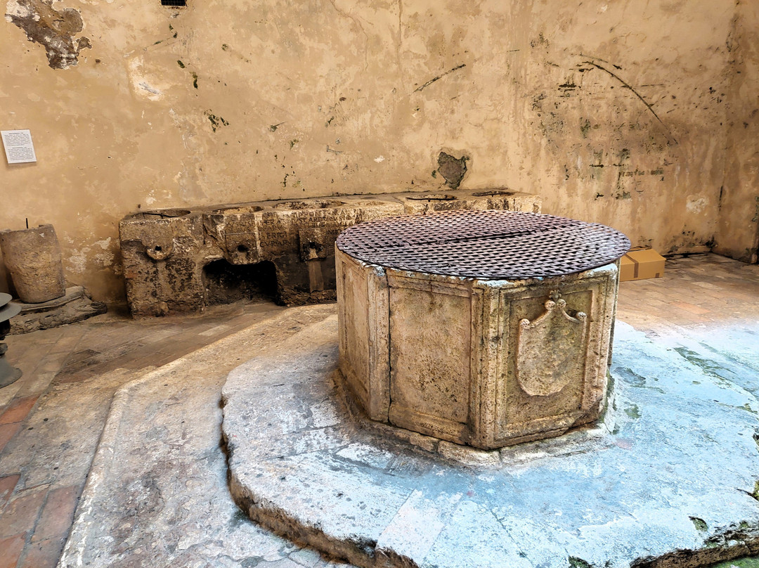 翻译:这里曾是罗马城市的广场,位于市中心,呈狭长状。这里商店不多(但有一家餐厅和几家酒吧,早上非常热闹),但其宏伟气势毋庸置疑。事实上,除了北边的一座十四世纪喷泉(类似于加里波第广场的喷泉)外,在环绕着它的众多中世纪和文艺复兴时期建筑中,城中两座最著名的民用建筑相互对峙:十四世纪的普里奥里宫,有高大的市民塔楼,旁边是宣读公告的小讲坛,一楼还有美丽的凉廊;十三世纪的波德斯塔宫(Palazzo del Podestà)(十四、十五世纪经过改建)由三座塔楼合并而成,如今是市政厅的所在地(除了欣赏立面的众多独特元素外,其内部庭院也值得一游)。与加里波第广场类似,尽管程度较轻,但广场在早晨会略显混乱,因为广场已通车,汽车,尤其是货车,在广场的各个位置来来往往;到了午餐时间,一切都平静下来,广场也变得更加宜居。