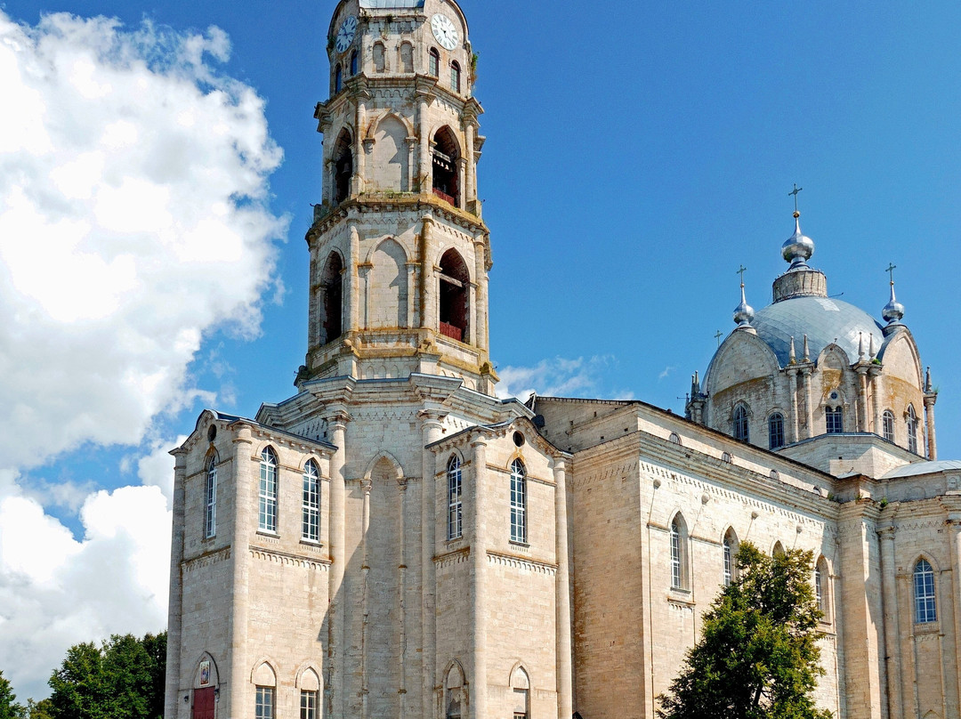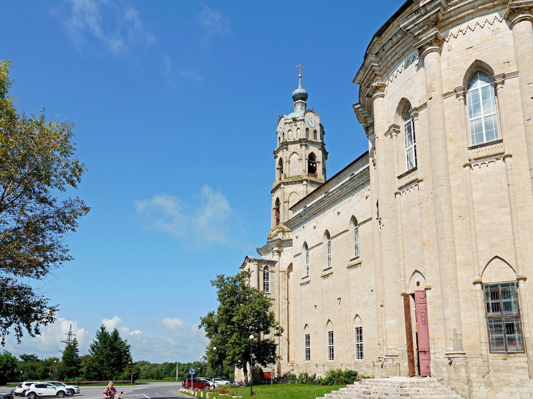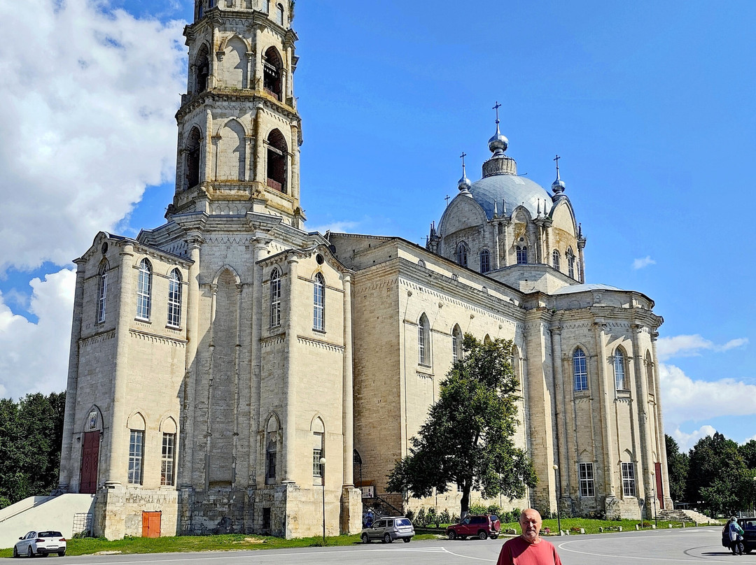 Крошечный посёлок (меньше двух тысяч жителей) и такой гигантский, прямо монструозный Храм в самом центре. Совершенно необычная архитектура, не встречавшаяся мне ранее в Православных Храмах. Псевдоготика? Неоготика? Эти названия ничего не объясняют, особенно , когда попадаешь в интерьеры Храма. Второй этаж был закрыт, так что не могу о нём судить, не видел. Но первый этаж совершенно БЕЗ ПРОСТРАНСТВА. То ли к этому привели архитектурные изыски? А возможно укрепление первого этажа, когда с большой временнОй паузой начали надстраивать второй? Он весь в колоннах и металлических тягах. И чем ближе к алтарной части, тем более сложной и затейливой формы становятся эти колонны, всё увеличиваясь в сечениях. И эта затейливость в итоге привела к тому, что за колоннами не стало видно иконостаса: он спрятан за ними и едва угадывается. Да и молельный зал, как таковой, отсутствует: длинный коридор между колоннами от входа и узкое пространство-щель перед колоннами, прячущими иконостас. По-моему, просто ошибка архитектора...